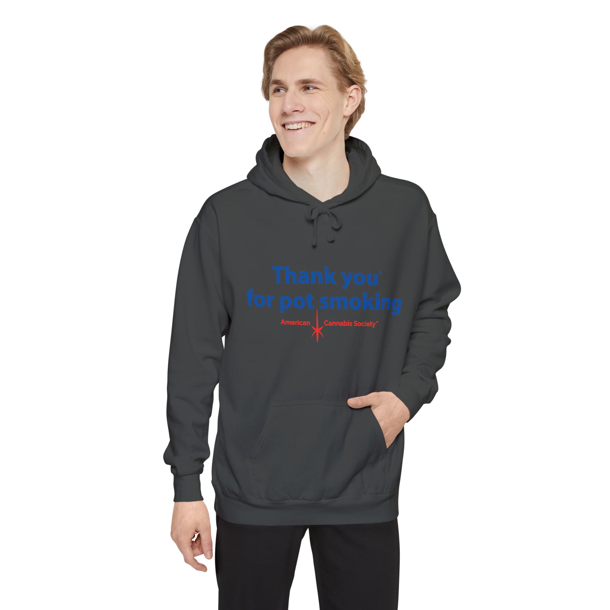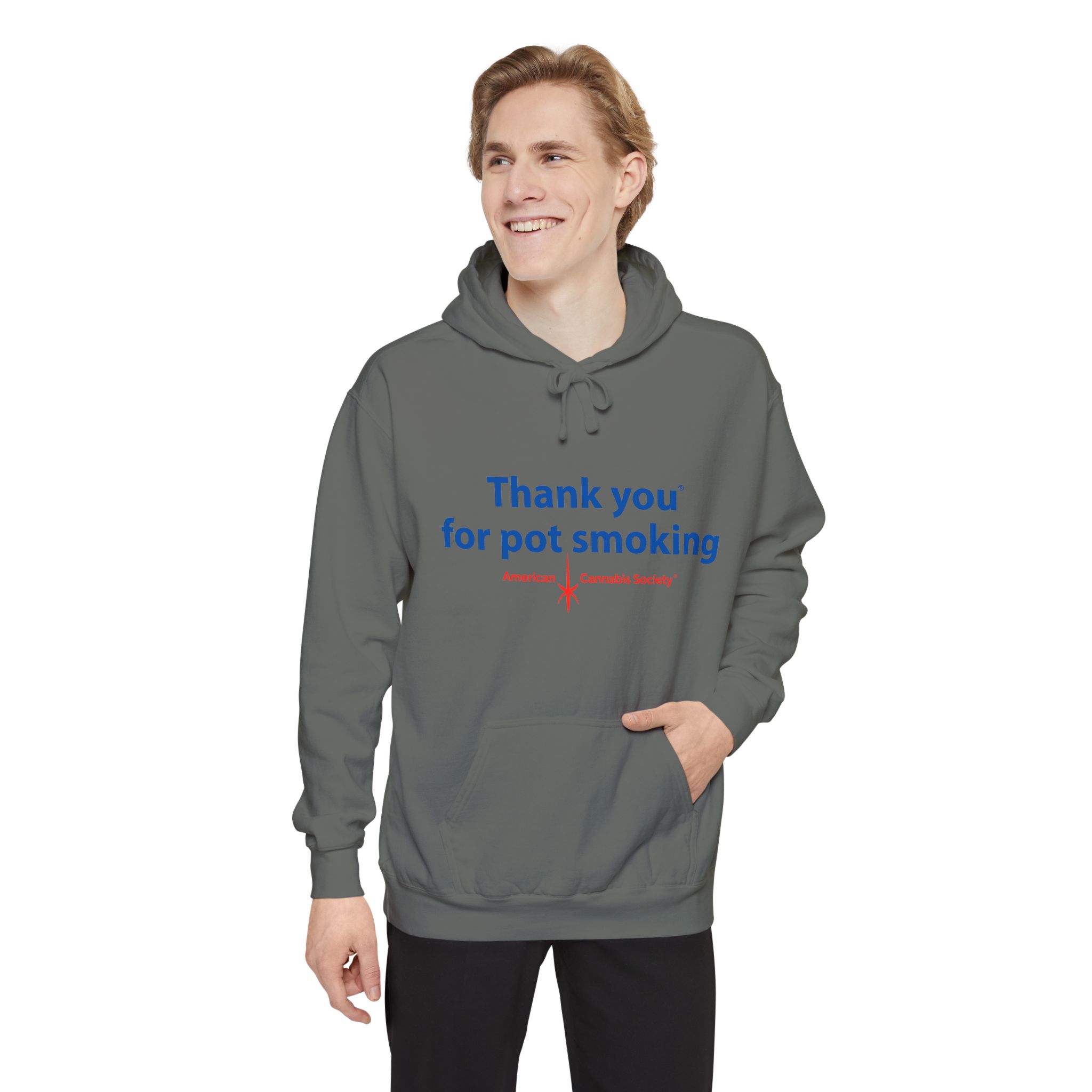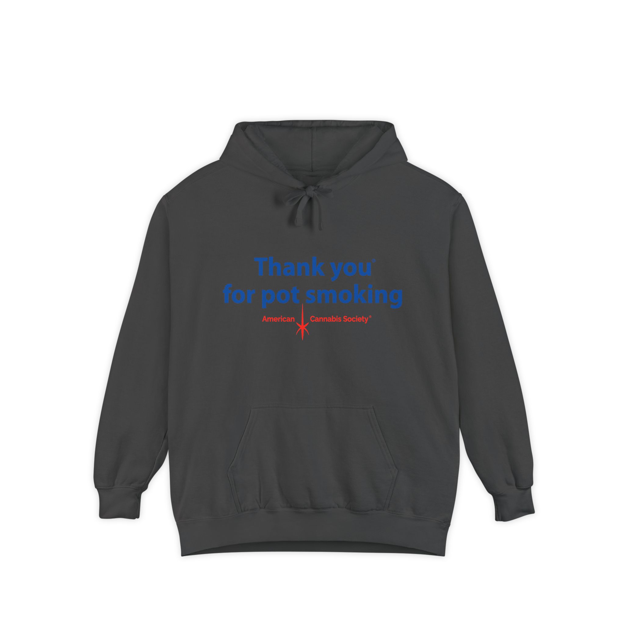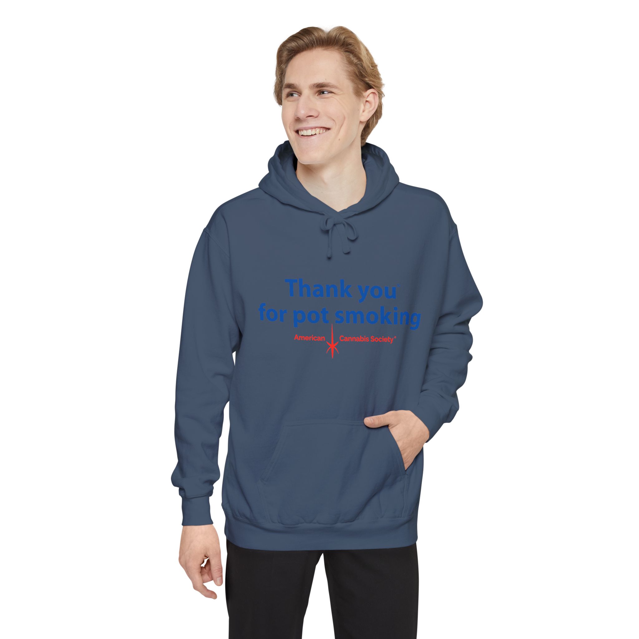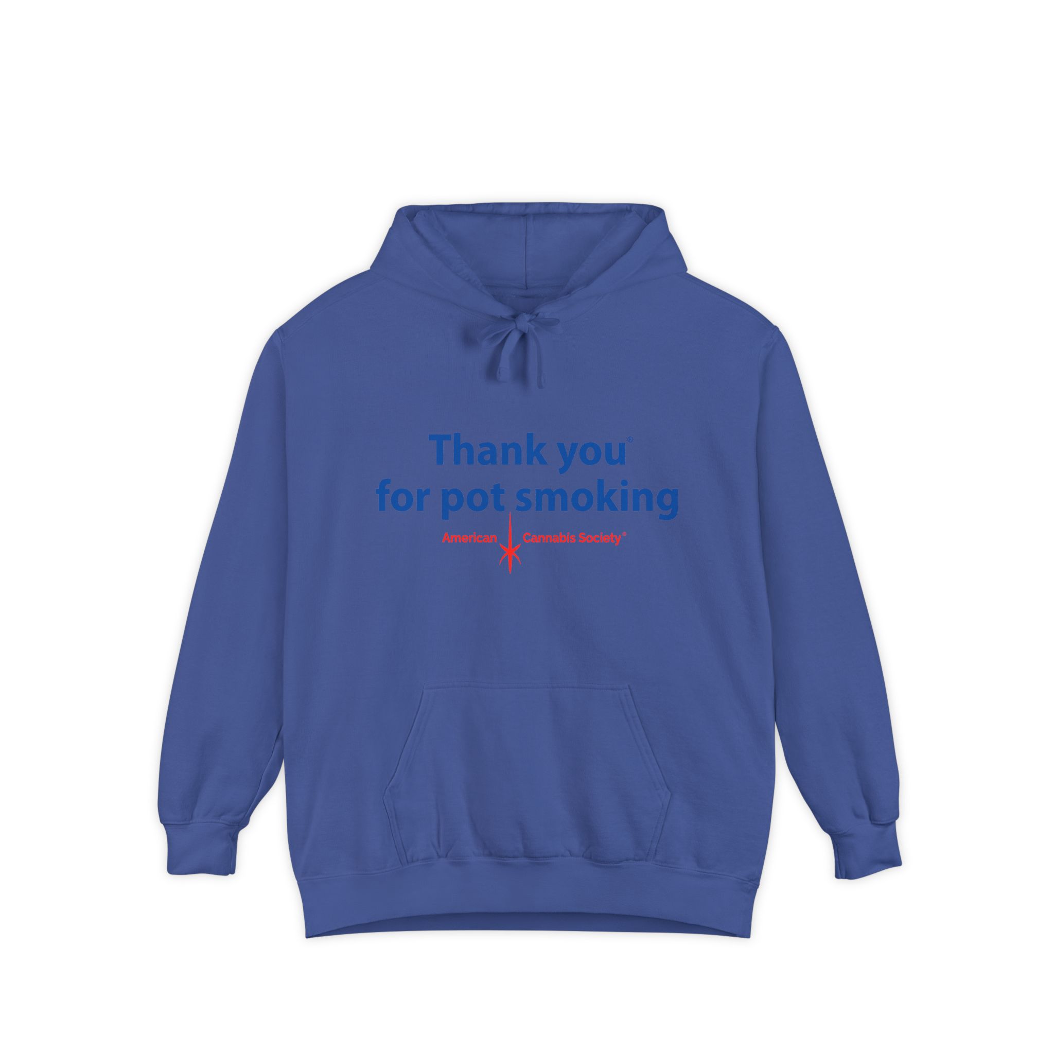 Wrap up in lived-in cozy calm. This relaxed-fit pullover hoodie is built for slow afternoons and late-night hangs, with the iconic Thank You for Pot Smoking® blue-and-red chest graphic delivered with quiet confidence.