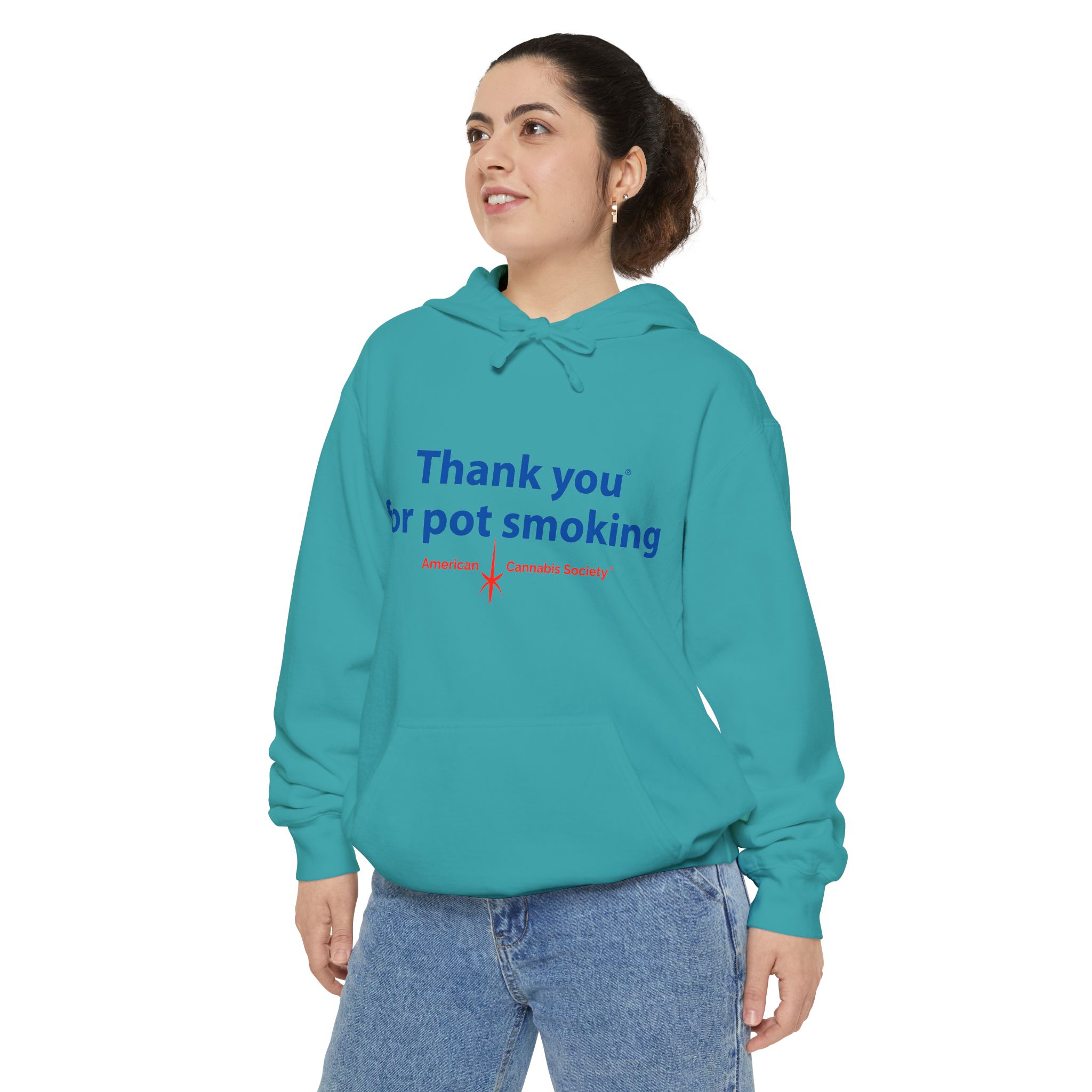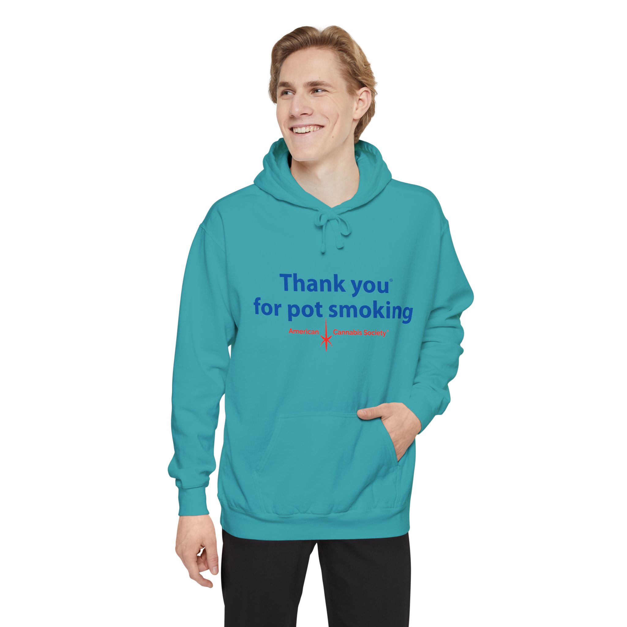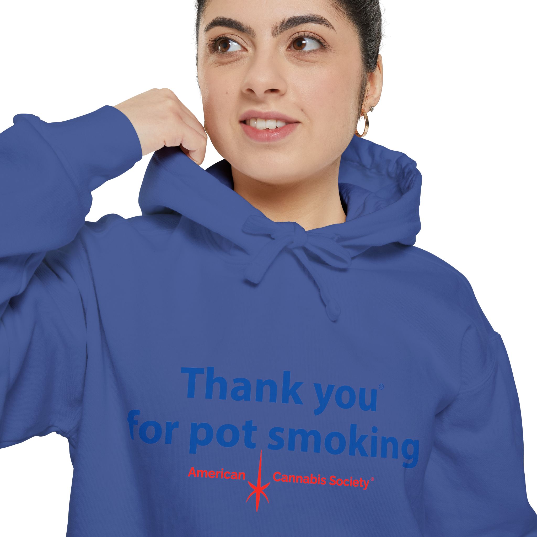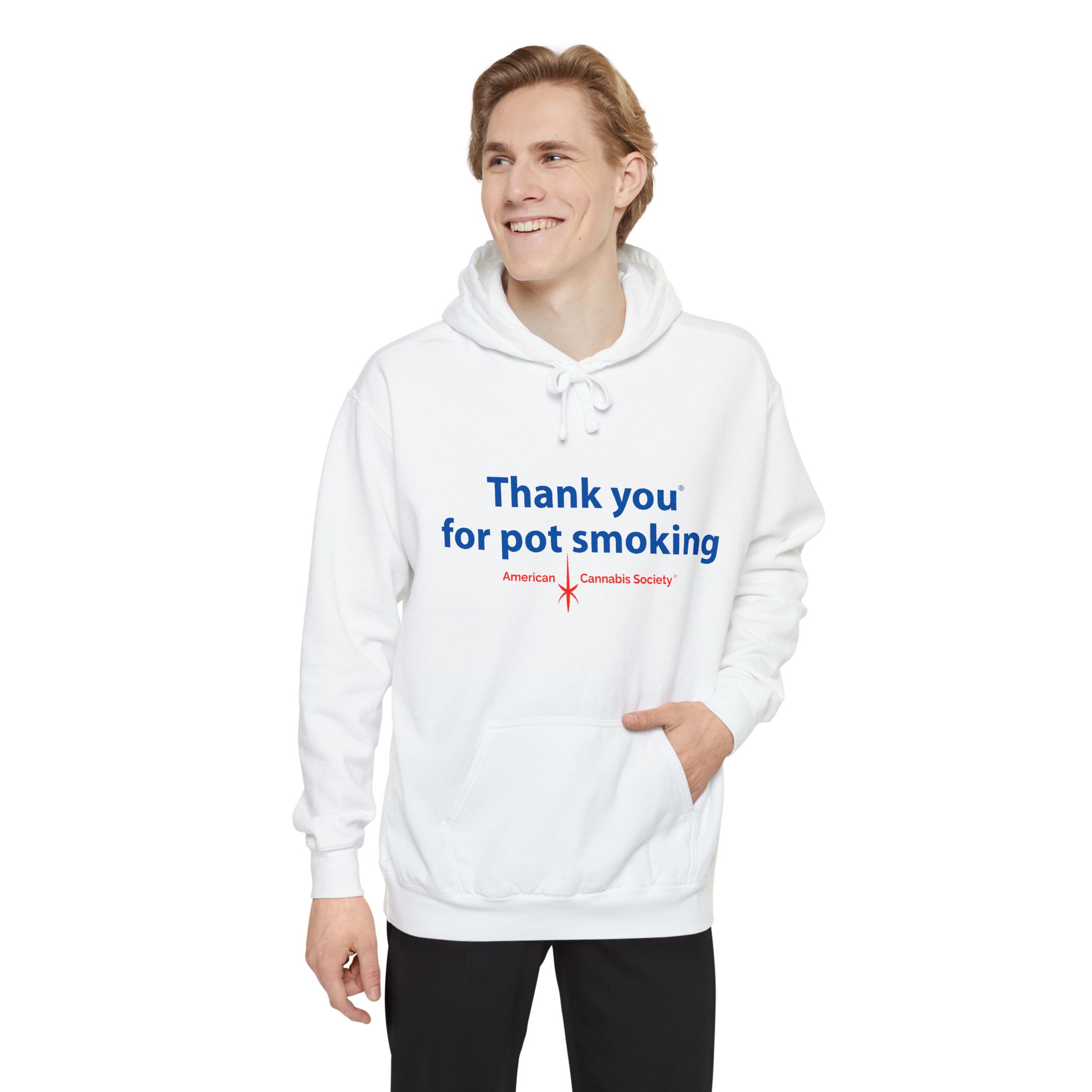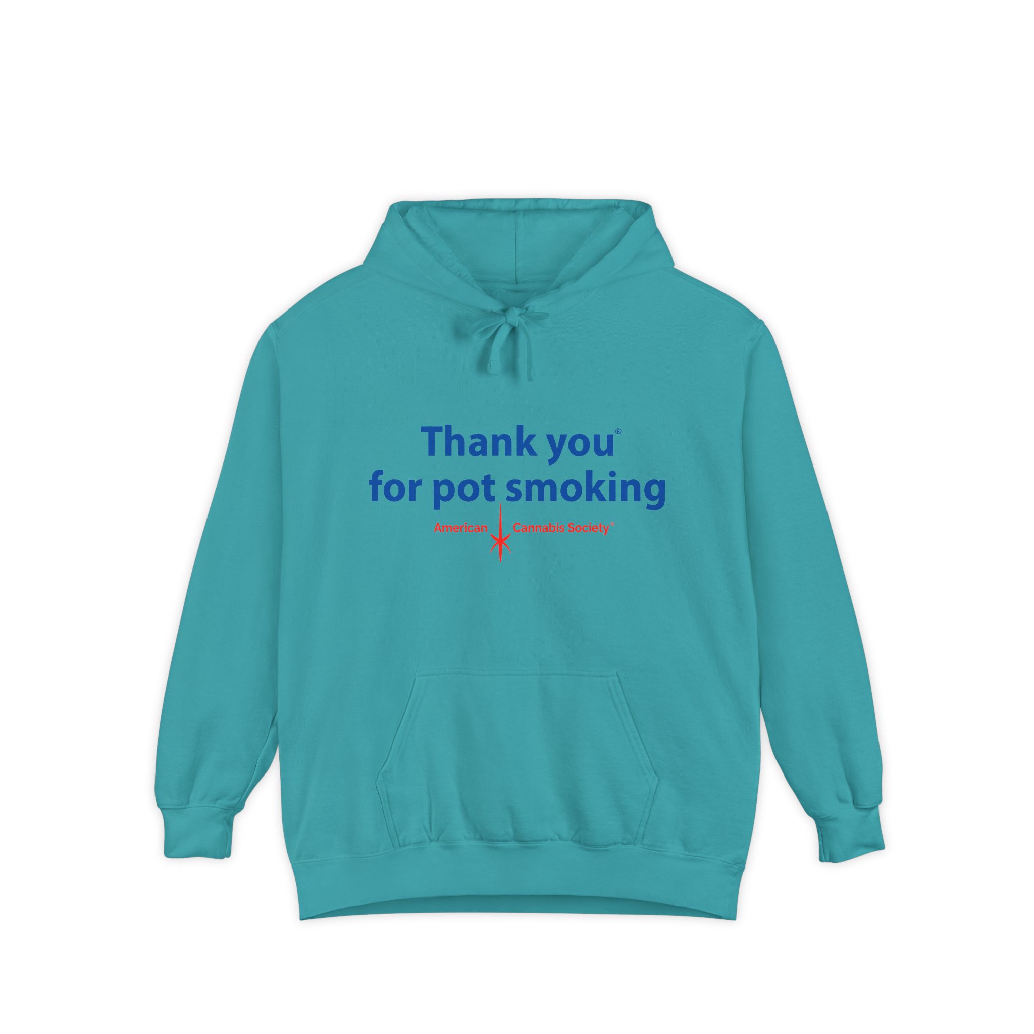 Wrap up in lived-in cozy calm. This relaxed-fit pullover hoodie is built for slow afternoons and late-night hangs, with the iconic Thank You for Pot Smoking® blue-and-red chest graphic delivered with quiet confidence.