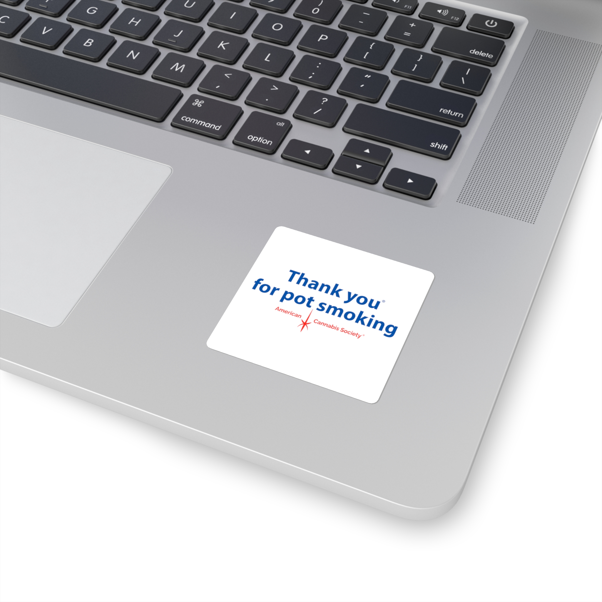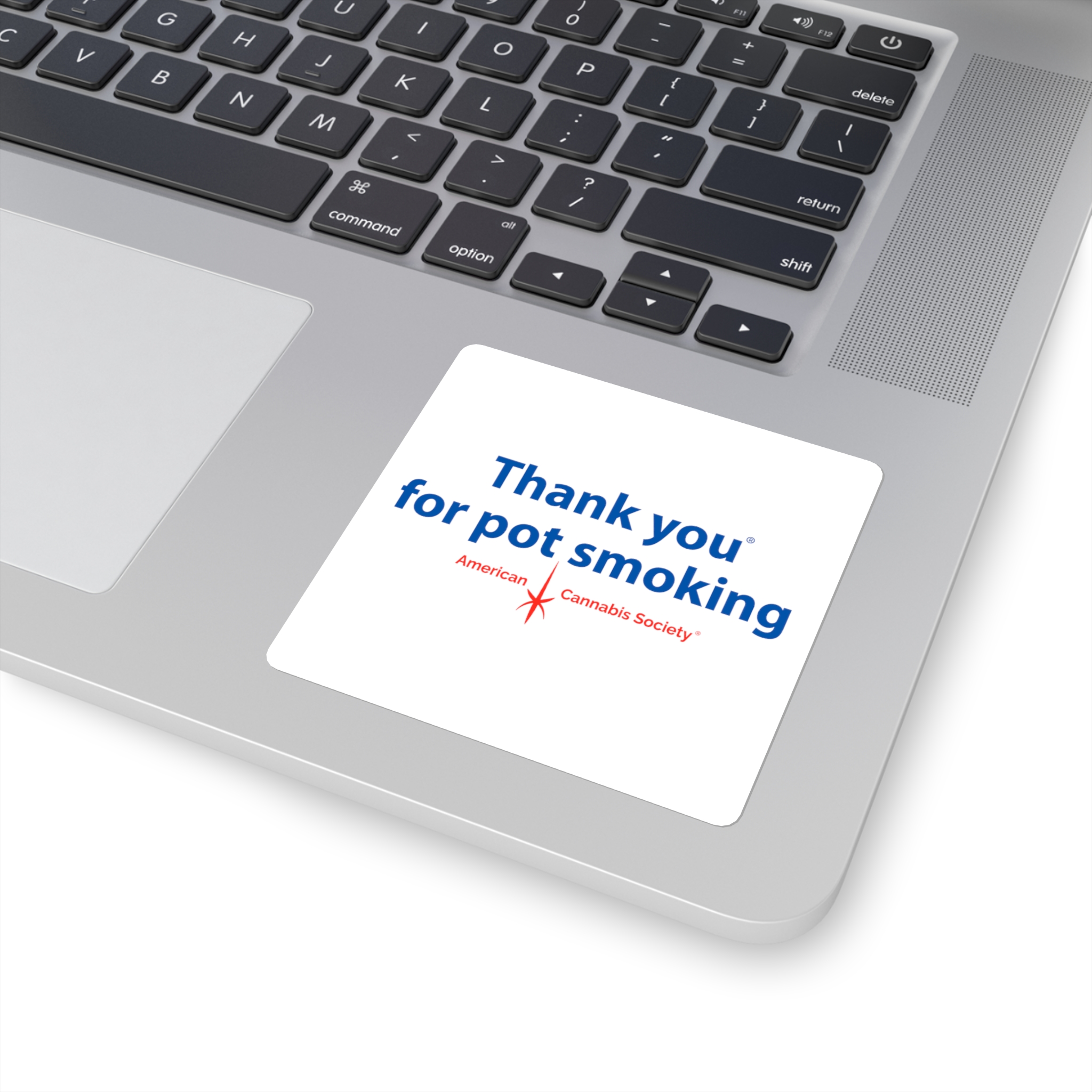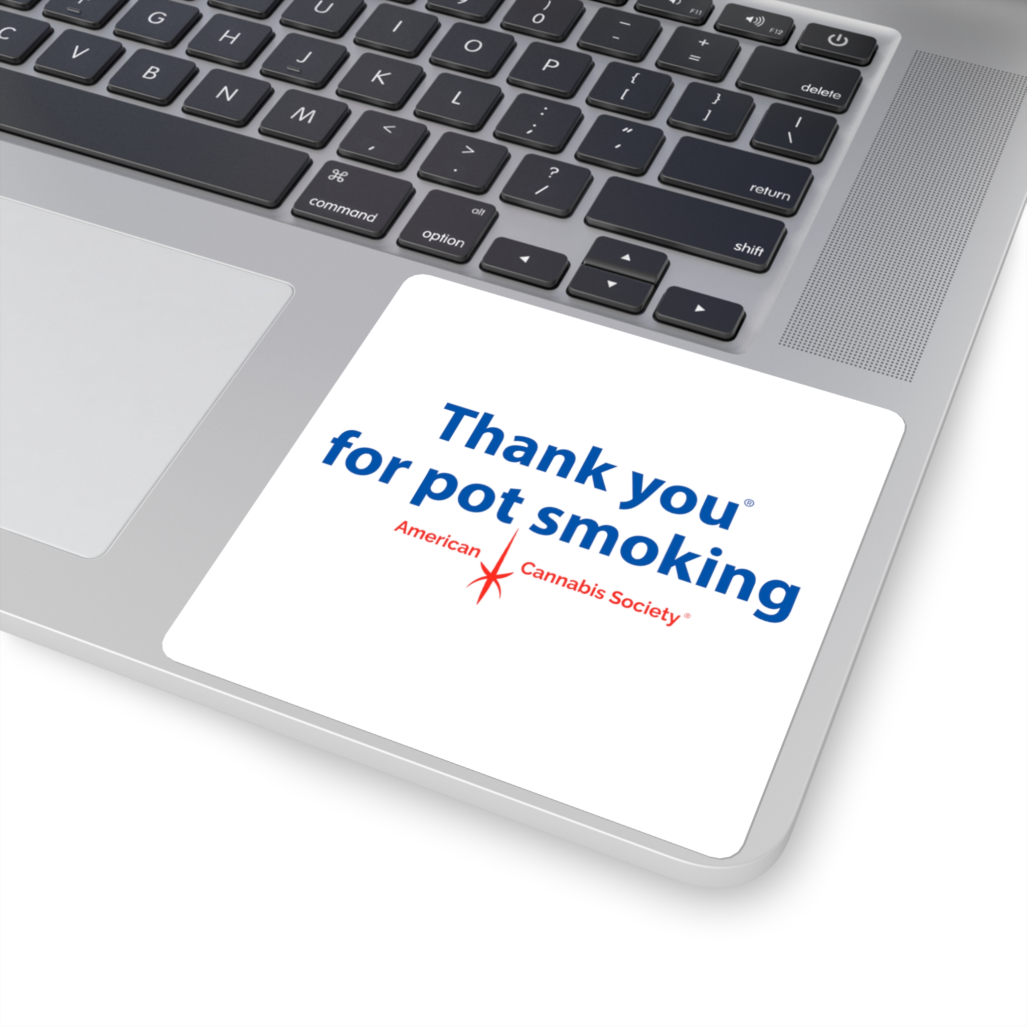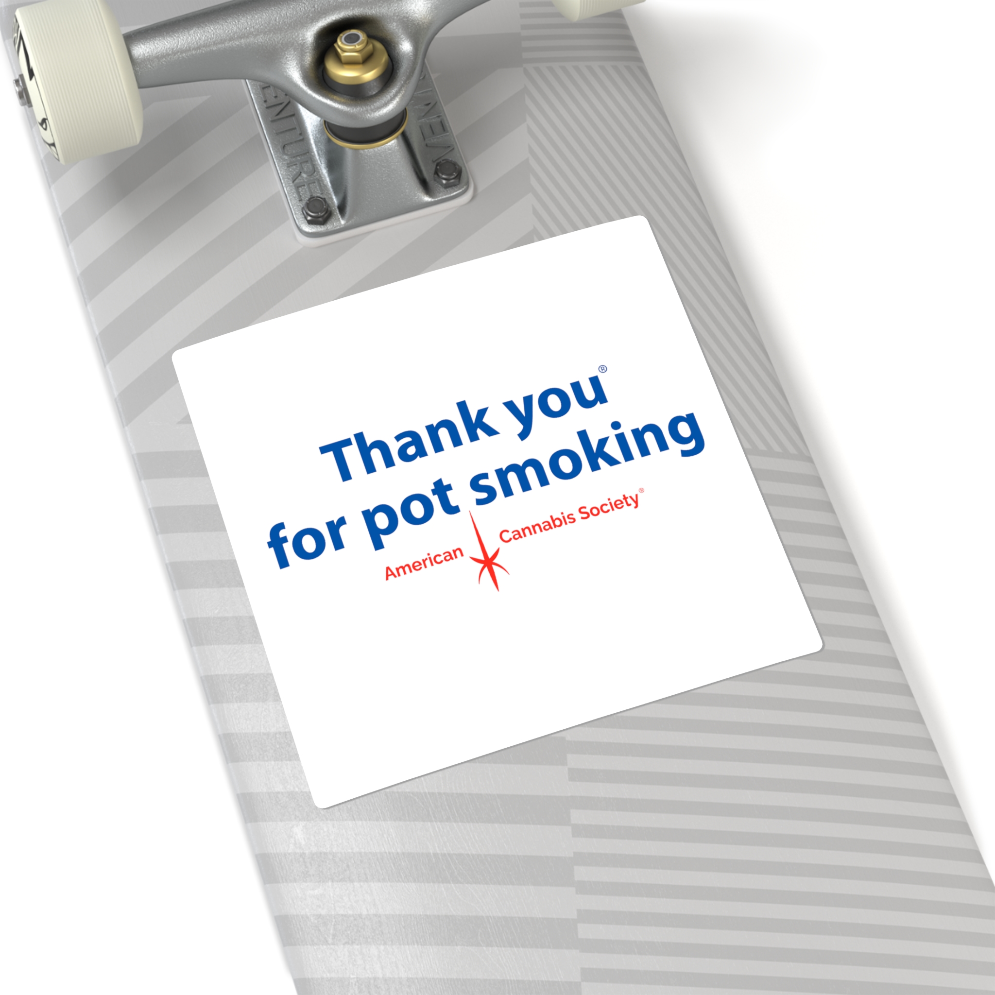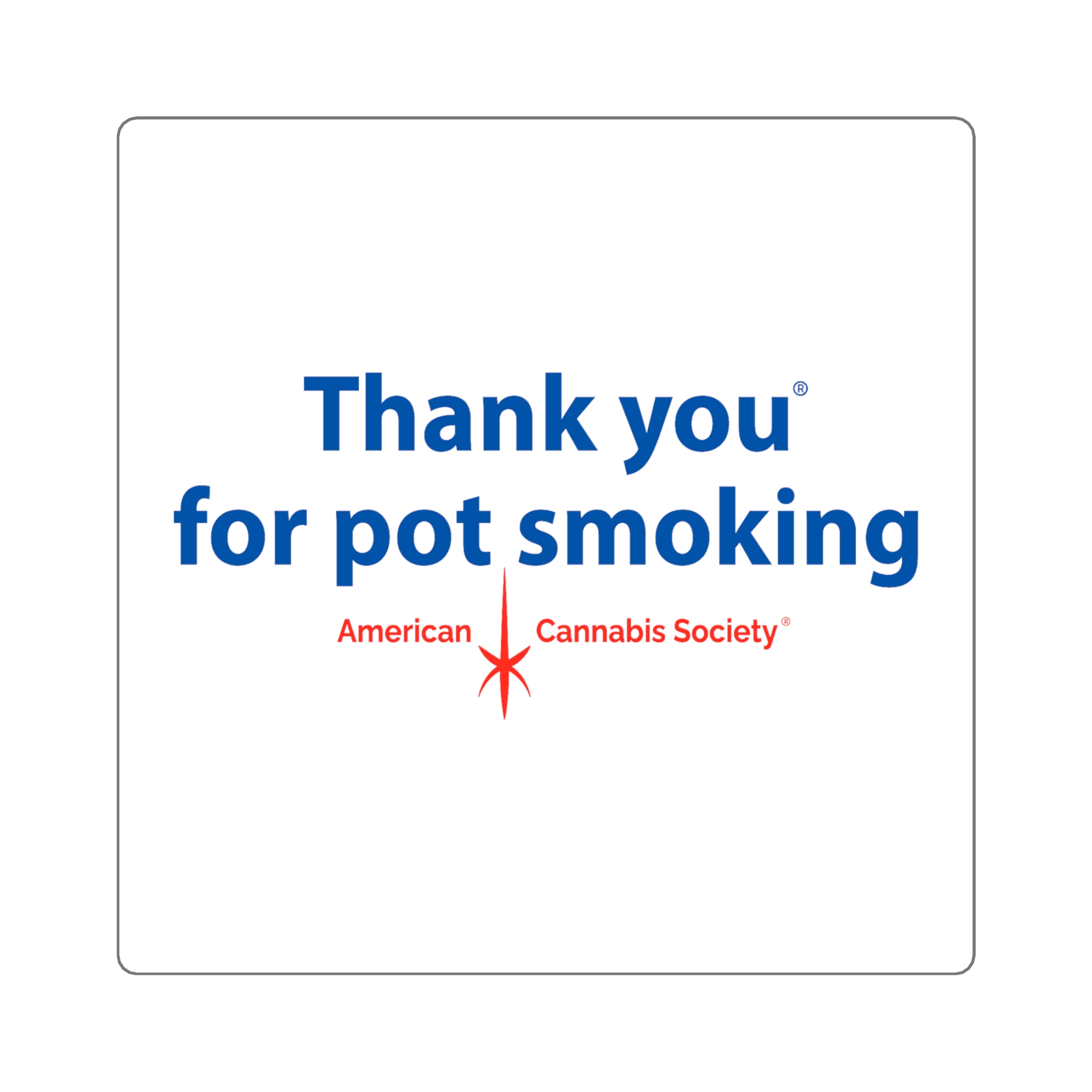 The original — a classic square white vinyl sticker carrying the Thank You for Pot Smoking® mark with the small red American Cannabis Society® stamp underneath. Clean edges, simple geometry, cheeky message. The most straightforward way to show your colors on a laptop lid, journal cover, or notebook.