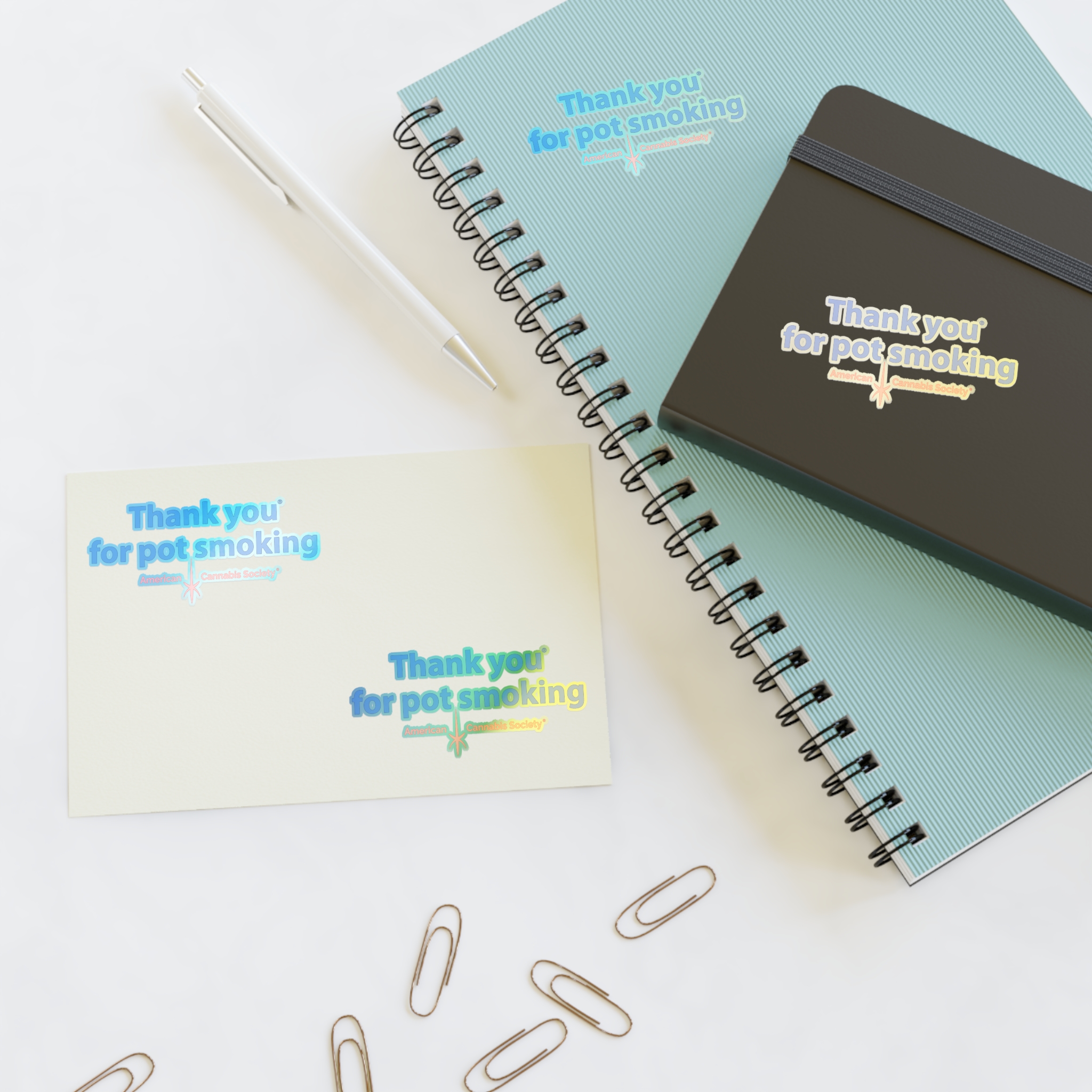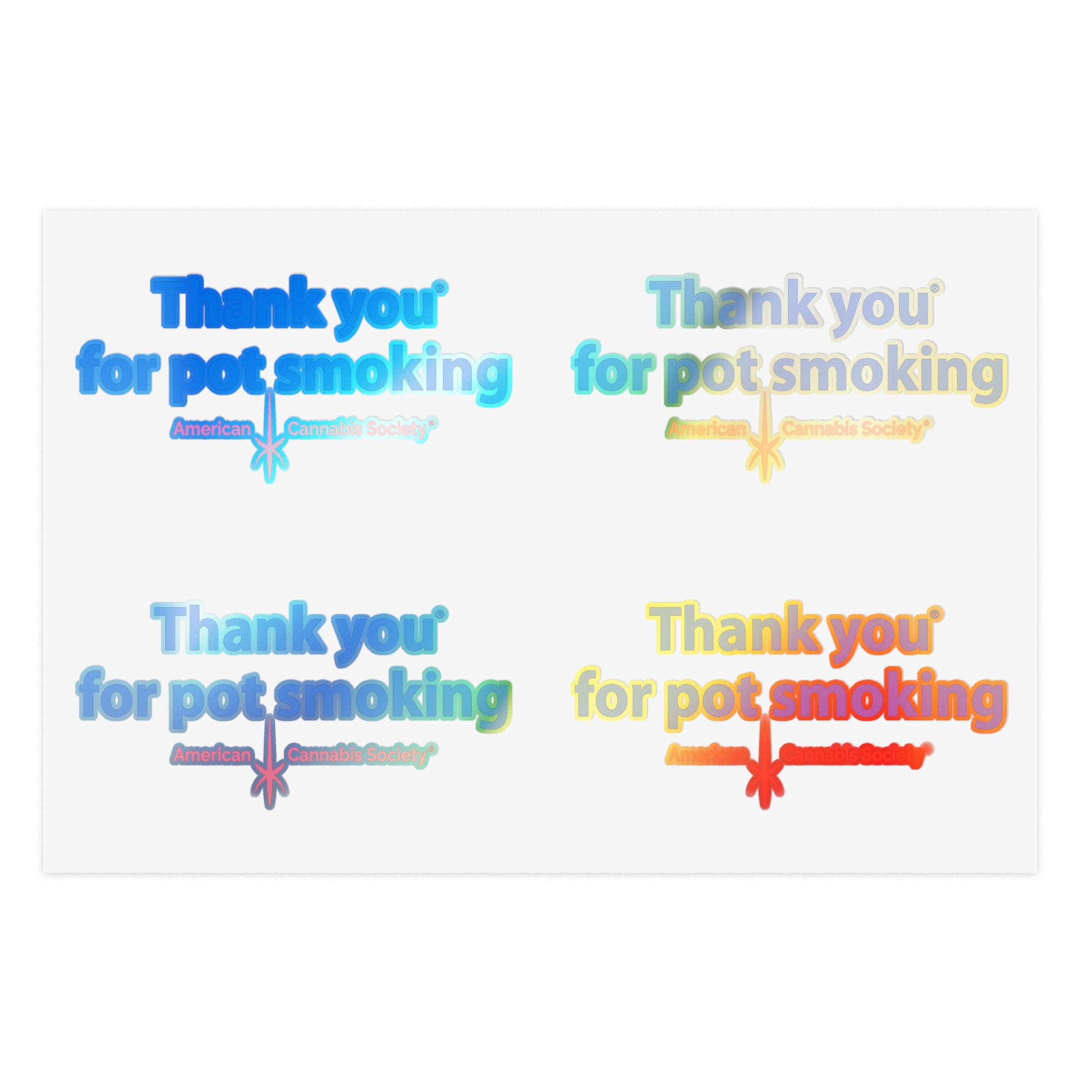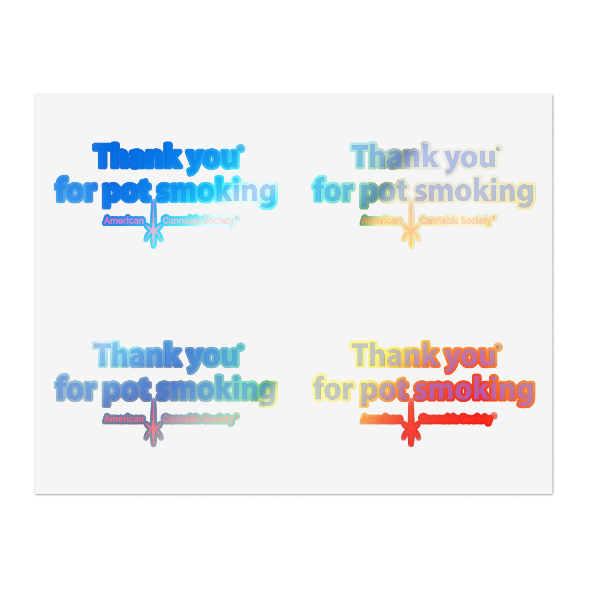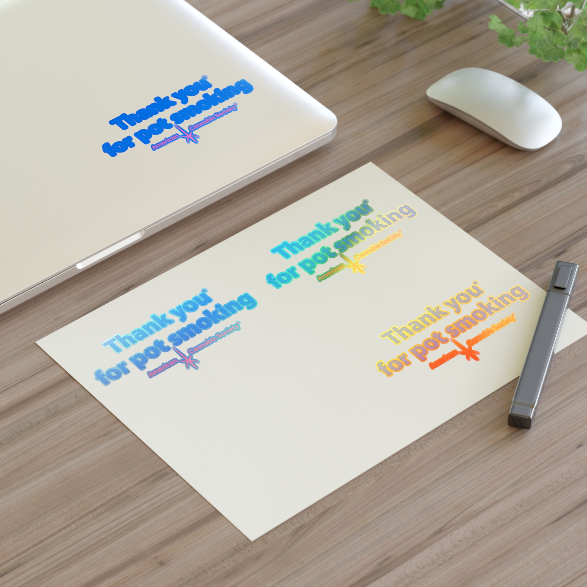 A die-cut sticker sheet built around the Thank You for Pot Smoking® mark — pick the finish that matches your vibe. Choose White for that classic vintage-poster pop, Transparent for clean float-on-glass placement, or Holographic for a rainbow-foil shimmer that reads loud across the room.
