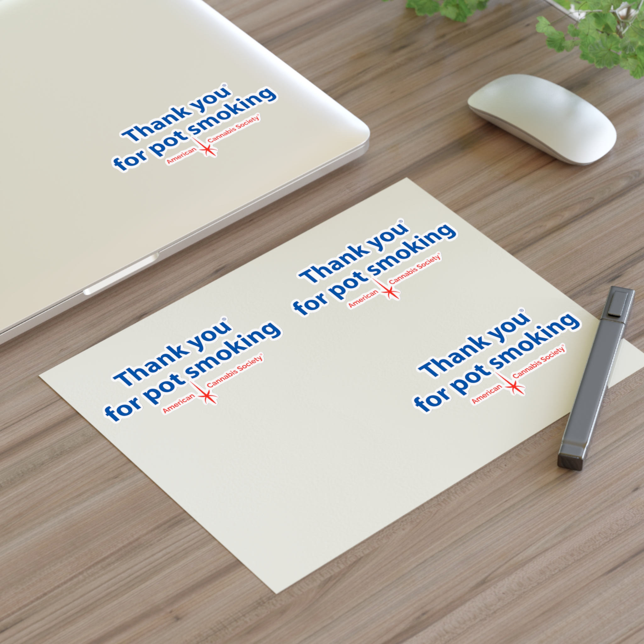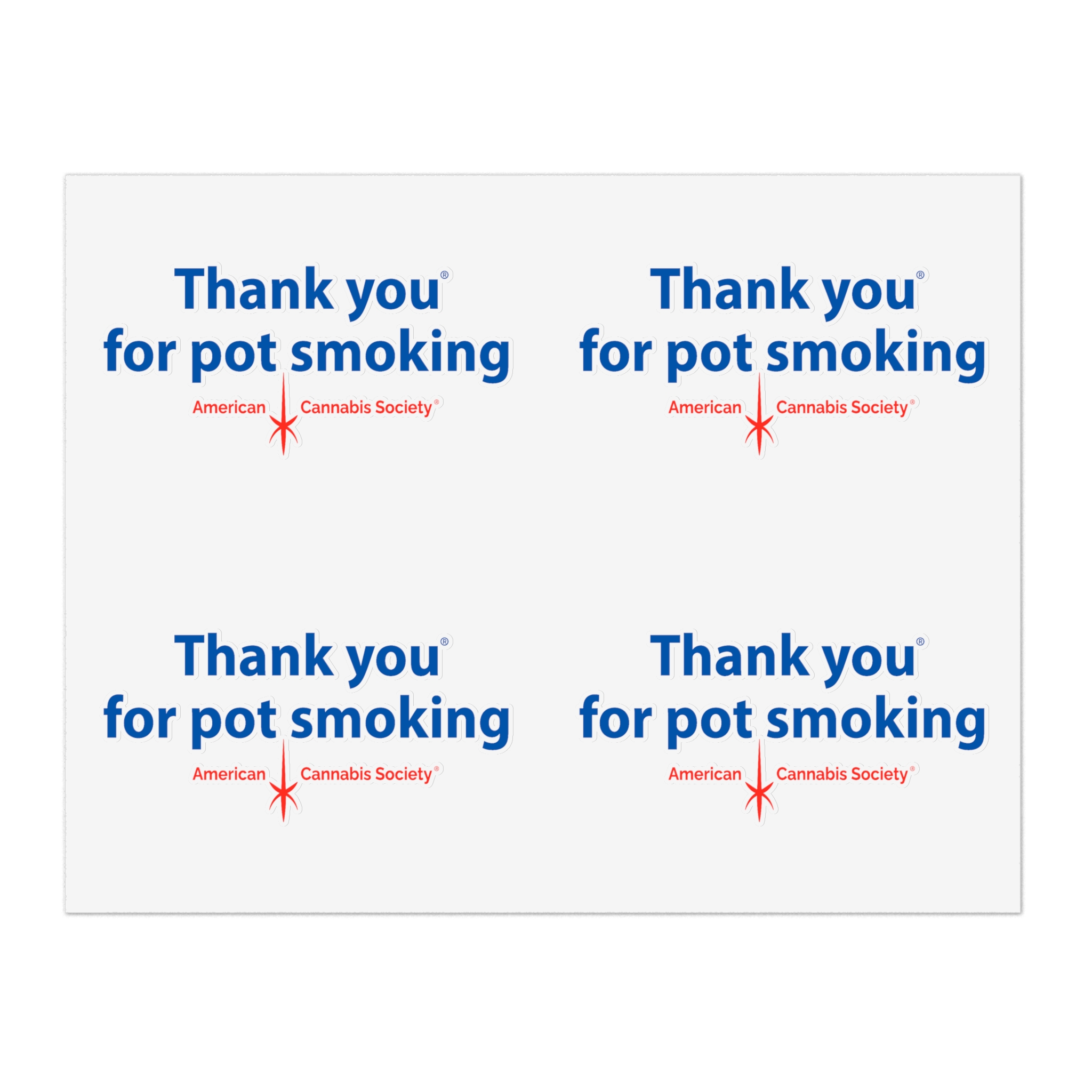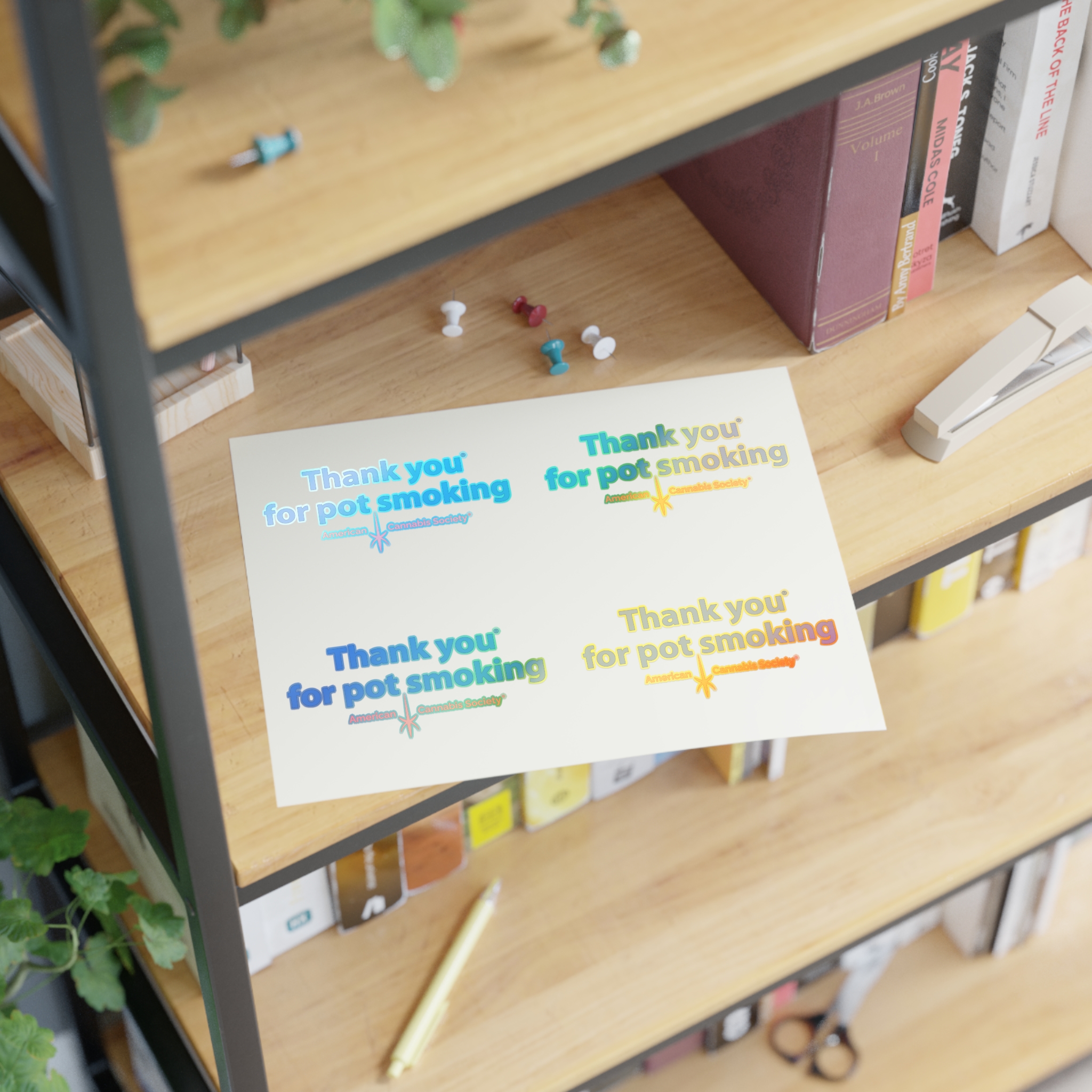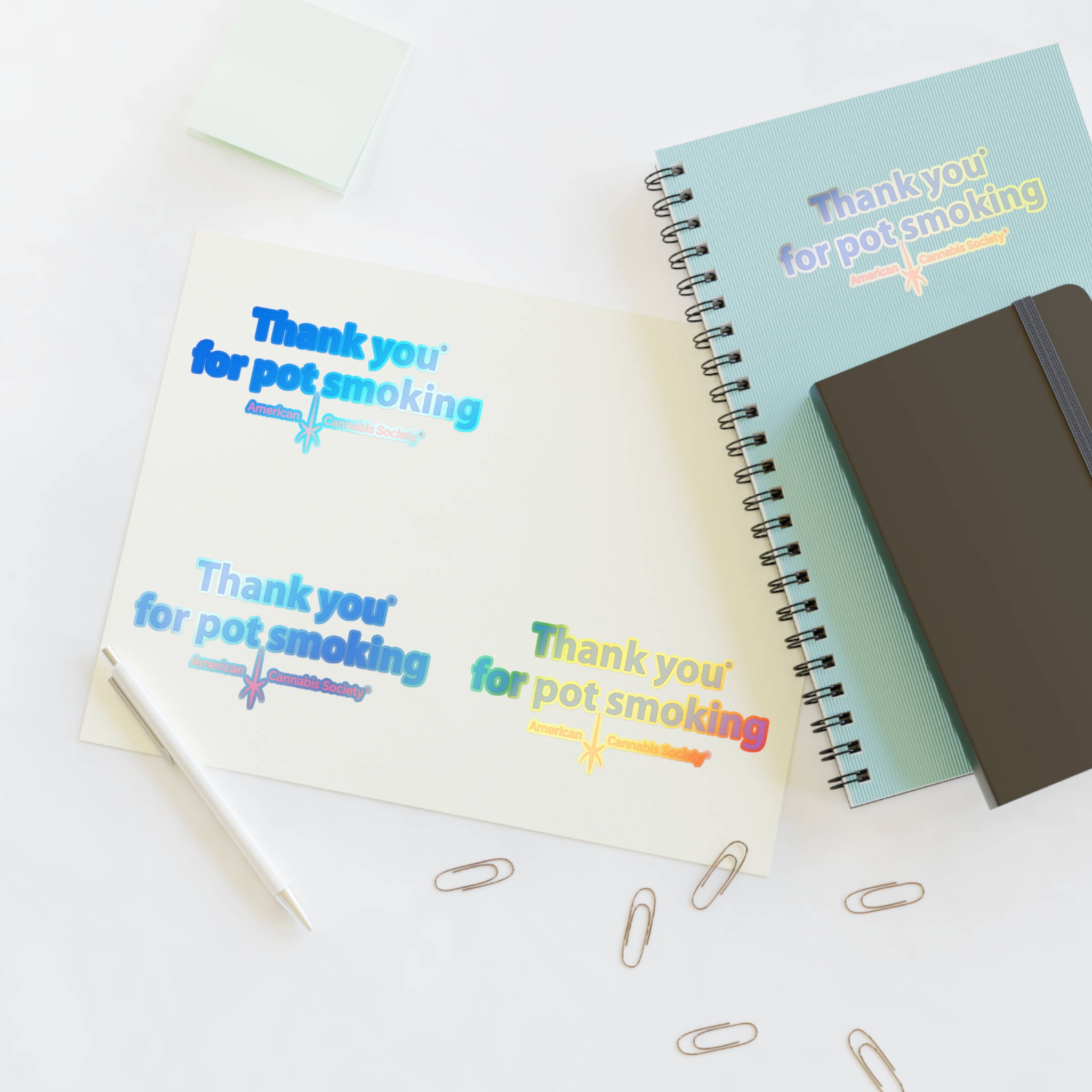 A die-cut sticker sheet built around the Thank You for Pot Smoking® mark — pick the finish that matches your vibe. Choose White for that classic vintage-poster pop, Transparent for clean float-on-glass placement, or Holographic for a rainbow-foil shimmer that reads loud across the room.