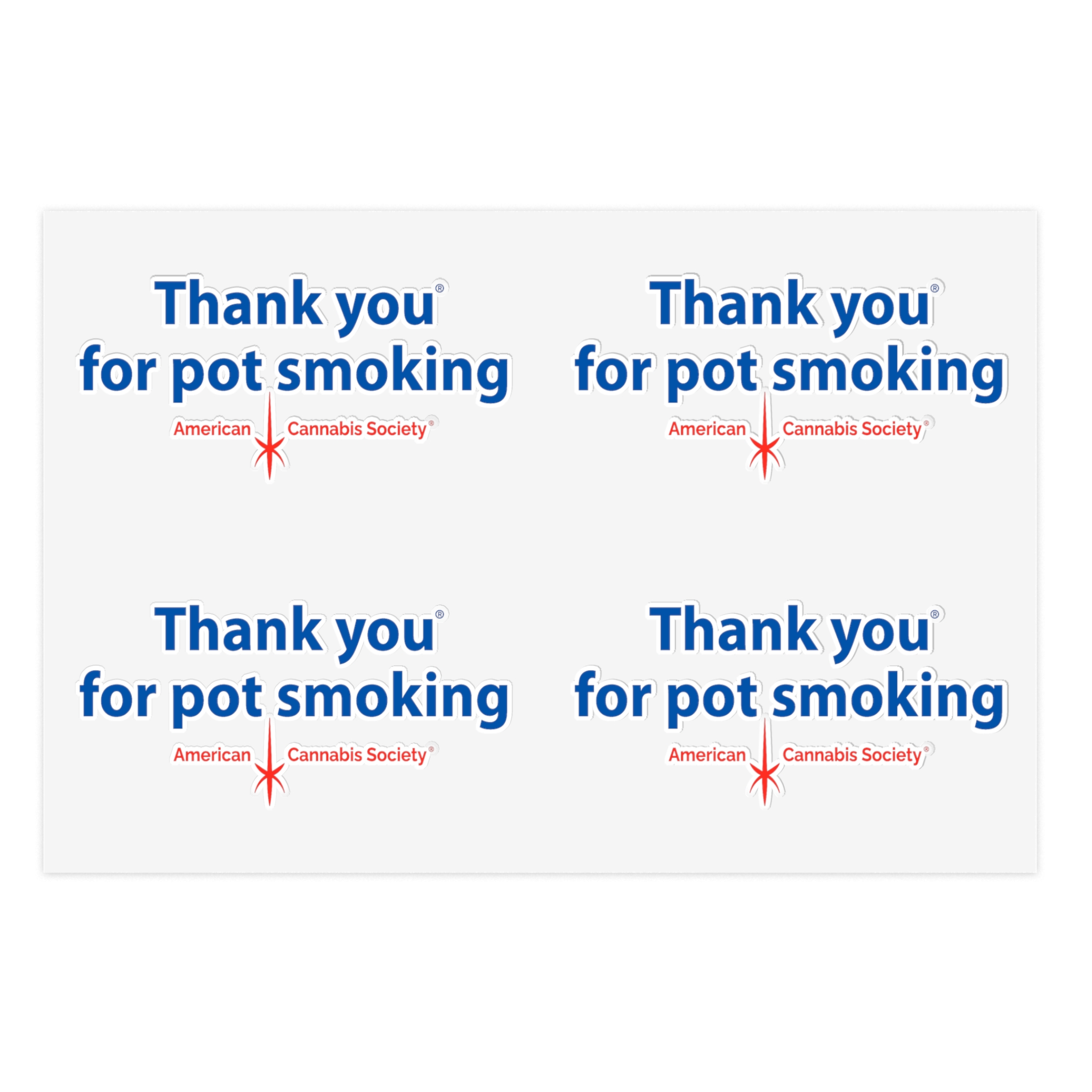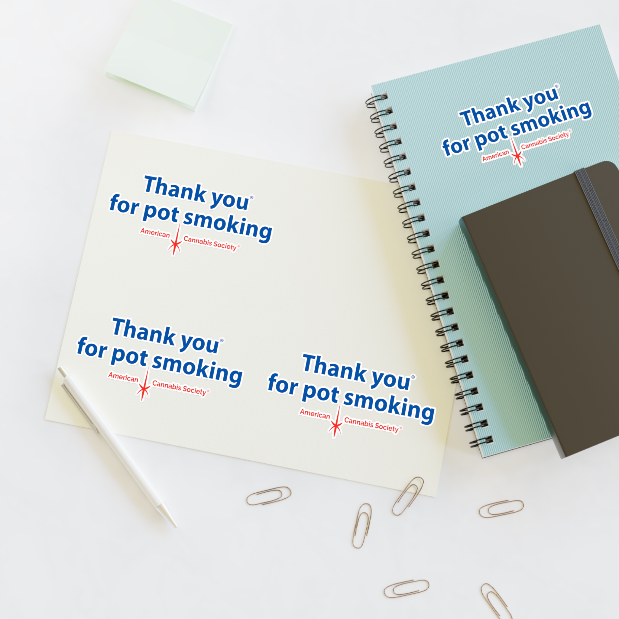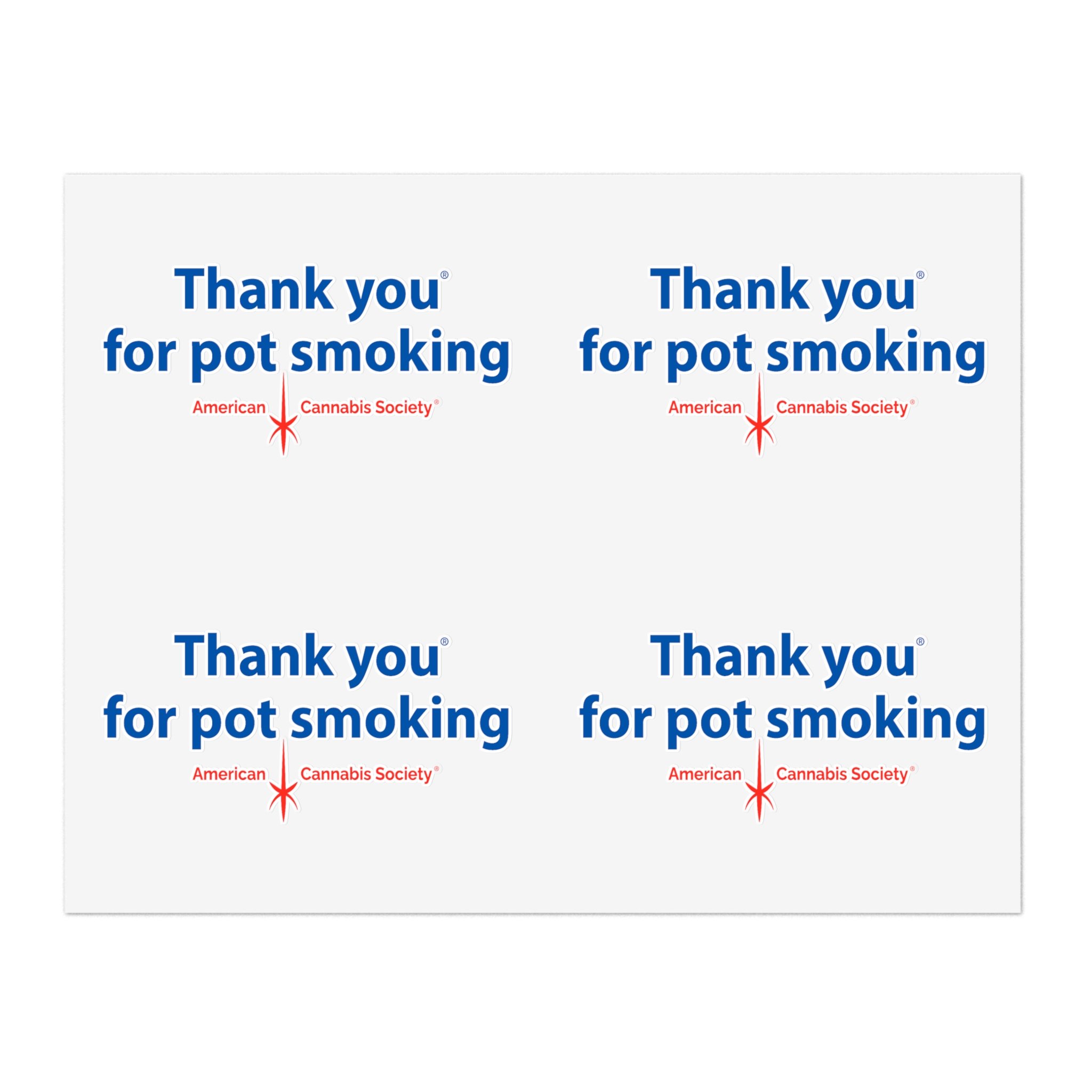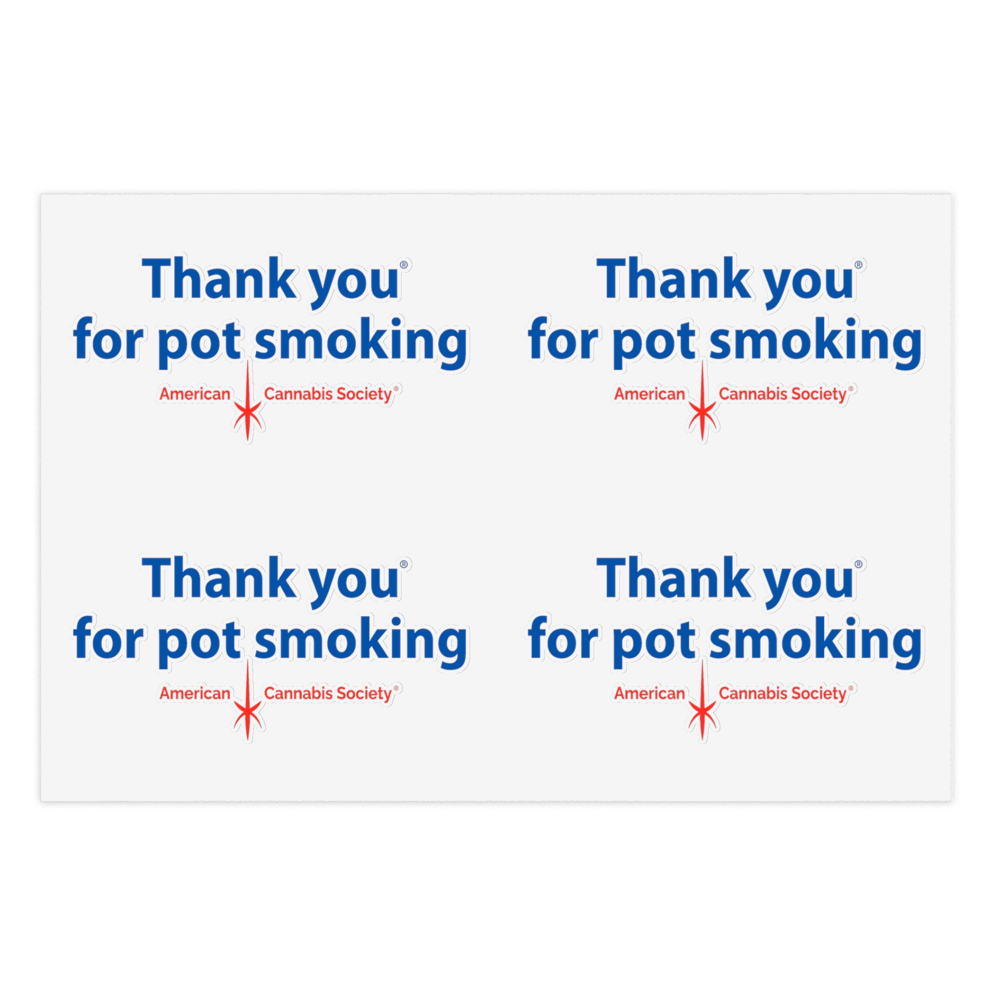 A die-cut sticker sheet built around the Thank You for Pot Smoking® mark — pick the finish that matches your vibe. Choose White for that classic vintage-poster pop, Transparent for clean float-on-glass placement, or Holographic for a rainbow-foil shimmer that reads loud across the room.